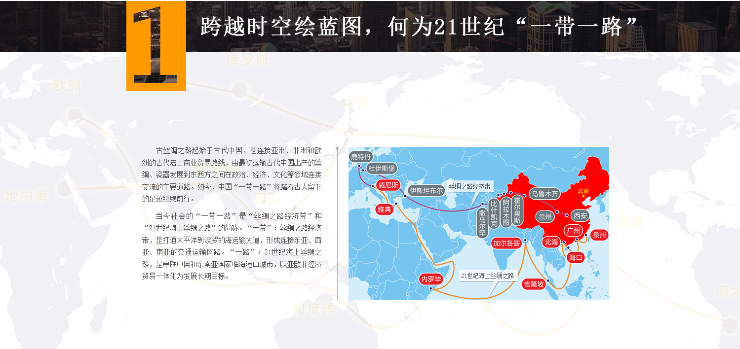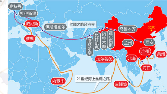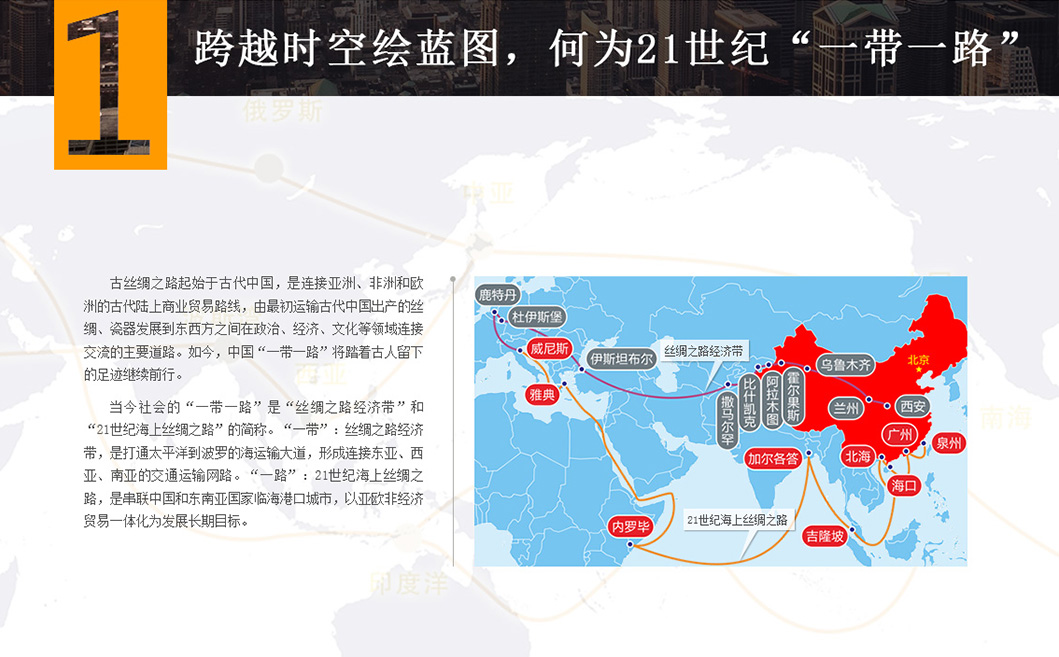 當(dāng)今社會(huì)的“一帶一路倡議”是“絲綢之路經(jīng)濟(jì)帶”和 “21世紀(jì)海上絲綢之路”的簡稱。“一帶”:絲綢之路經(jīng)濟(jì)帶,是打通太平洋到波羅的海運(yùn)輸大道,形成連接?xùn)|亞、 西亞、南亞的交通運(yùn)輸網(wǎng)路。“一路”:21世紀(jì)海上絲綢之路,是串聯(lián)中國和東南亞國家臨海港口城市,以亞歐非經(jīng) 濟(jì)貿(mào)易一體化為發(fā)展長期目標(biāo)。