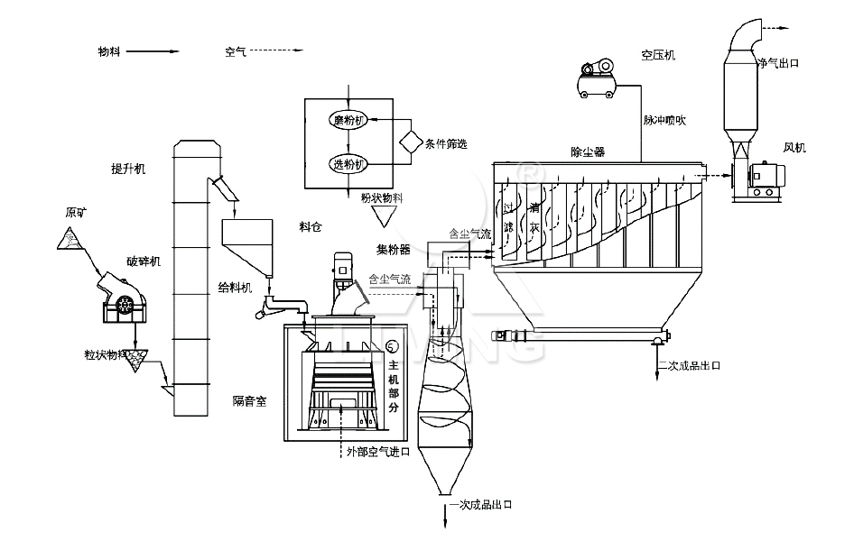 1可直接粉磨生產(chǎn)650目的重鈣,通過(guò)增加二次分級(jí)裝置,可生產(chǎn)1500目的超細(xì)重鈣,細(xì)可達(dá)2500目。